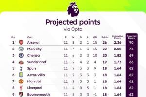 如果以这样的方式进行计算,阿森纳将在赛季末以90个积分的高分夺冠。目前正一胜难求的狼队若整赛季都保持这样的状态,最终将只有7个积分。